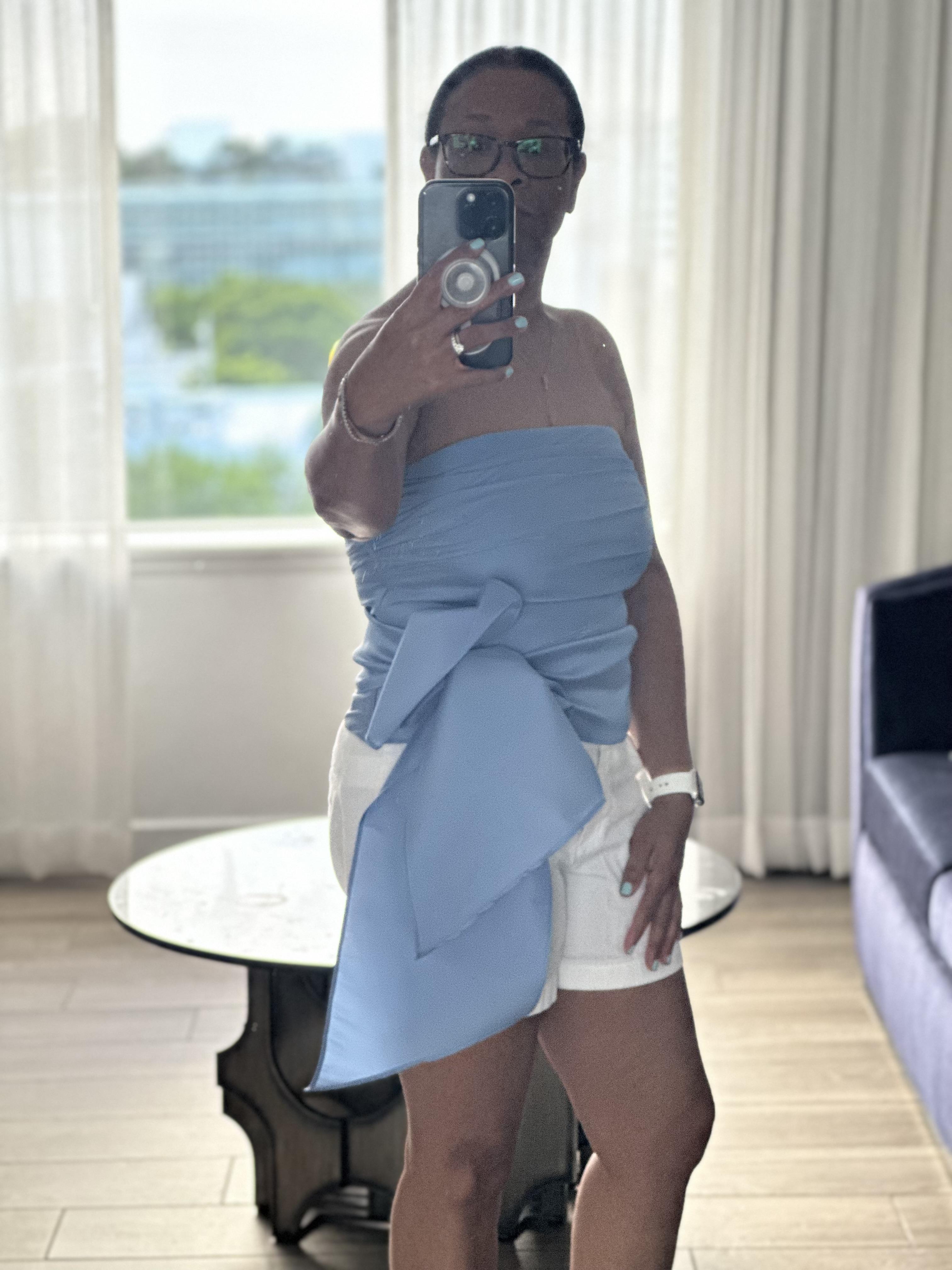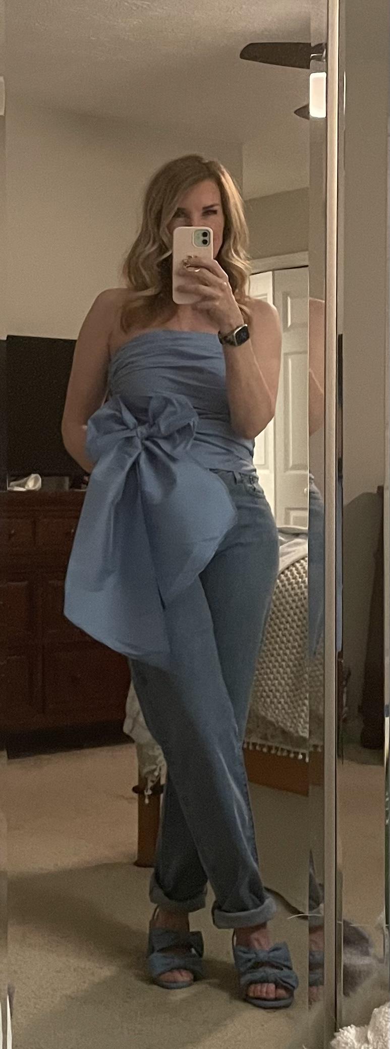 June 17, 2023This top is one of my favorite purchases ! It is such a beautiful color and fabric. I found it to run a bit big. I'm 128lbs 34b.usually xs or 2-4. Purchased on sale and unfortunately size 2 was sold out so I took my chances on a 4. Its big but the bow cinches in the waist .Thankfully, even though a bit large on me and strapless, it doesn't fall down. I wore a strapless bra with it but I could see someone wearing it without one ,the beautiful taffeta material is that substantial. Can be dressed up or down, tons of compliments, a winner!!! Only downside is dry clean only but when you see and feel the taffeta in person you can see why.