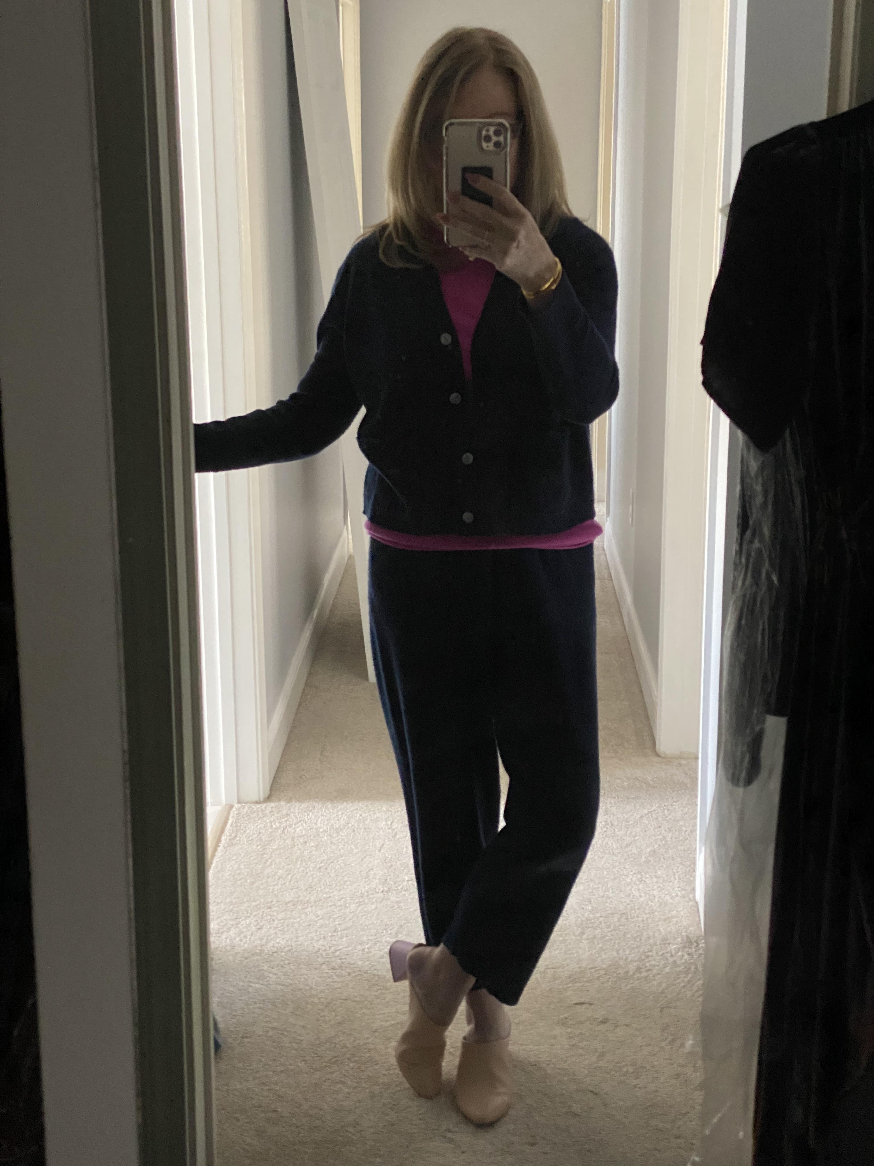 April 21, 2022Ha! My new working from home ‘cashmere suit’ makes me feel put together for any MS Teams call. The matching set, the drawstring pants and cardigan (which I purchased in navy)… are an easy ‘go-to’ for this new hybrid working environment. I paired it with a cashmere tee (which I have a number of). Super comfortable, cozy, warm and stylish. These are my first cashmere pants and I love them!!! My regular size ‘small’ fit perfectly.
