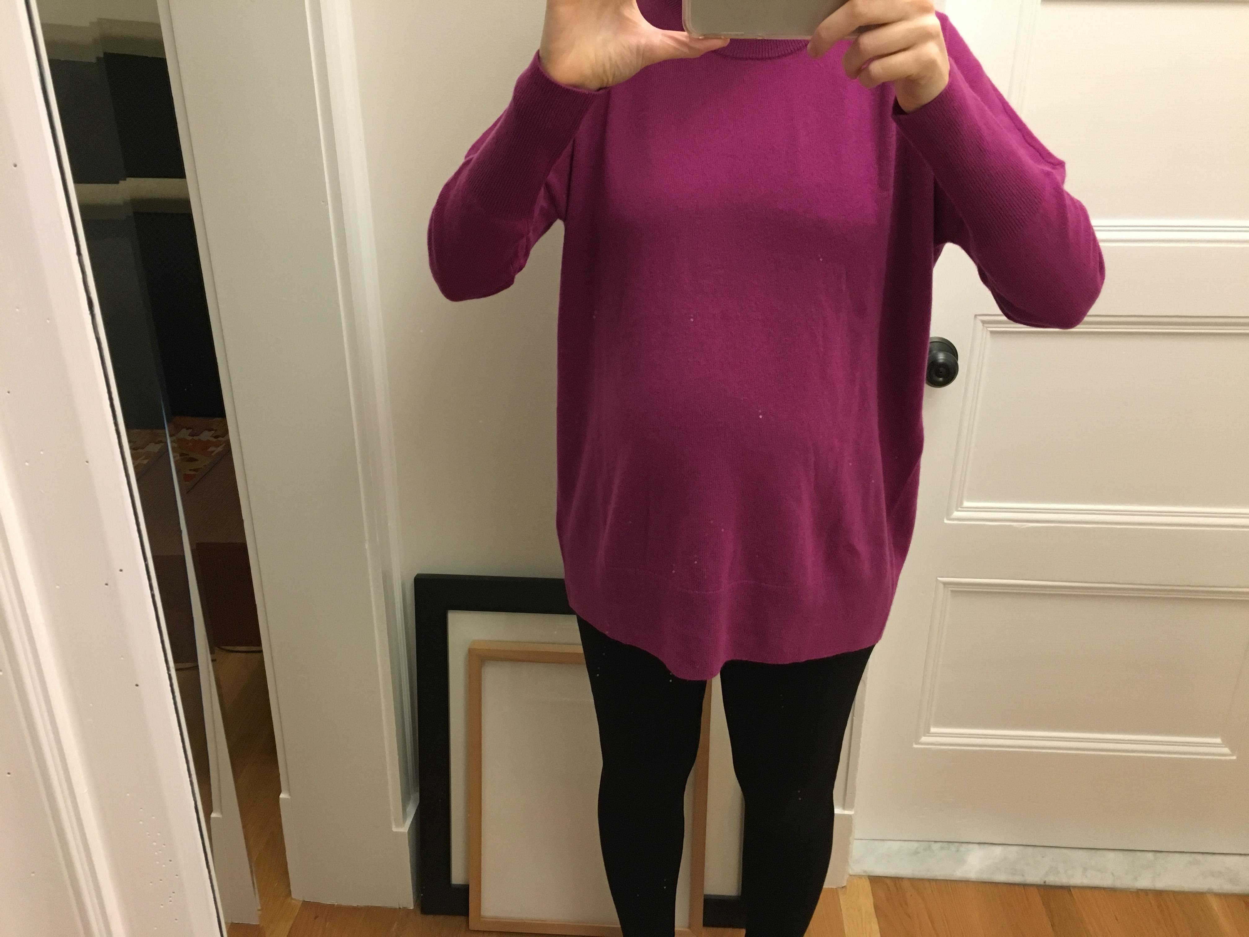October 5, 2019I love this sweater. I bought it in the gray. I found the cashmere to be soft and comfortable. I am not pregnant, but I’ve found that Hatch products fit my 5’10”, 145 pound frame as if they were made for tall women. The sleeve length wasn’t too short and the length was wonderful!