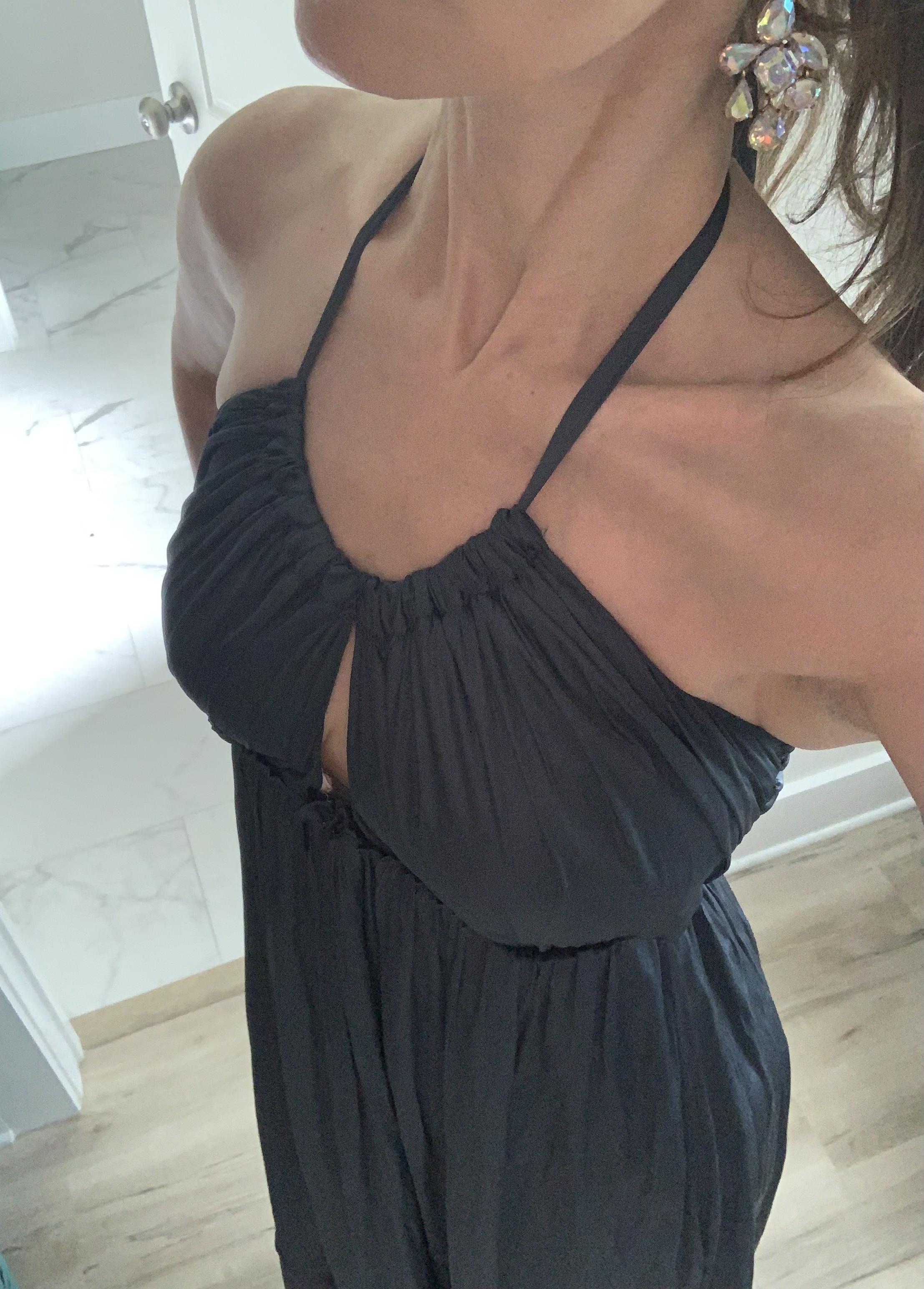 August 19, 2022Love this dress, BUT issues w sizing & cut so here’s how I got perfect dress (for me)! 5’2 101lbs and 34b, normally 00 in dresses NOT IN THIS! If I wanted fit exactly as the model 2 would have been perfect, possibly a 0 but reading the reviews a 0 sounded like it would have been too tight around rib cage to breathe. I tried sz 2(arrived damaged so had to exchange) but sized up one more time to a 4, knowing it would be too big BUT pinning together the lower center! Love cut out so much more now that I was able to make it much smaller & subtle bc I was able to close it up and it became a thin slim opening instead of a triangle shape which I think makes one look “widened” honestly and don’t personally like the look of even on the model (I have it pinned in the picture and looks great you can’t tell). I’m wearing a bra (which you can see peeking a bit in photo but it has a clear center strap across front. If order too big just pin then sew ribcage area closer for goddess dress perfection!