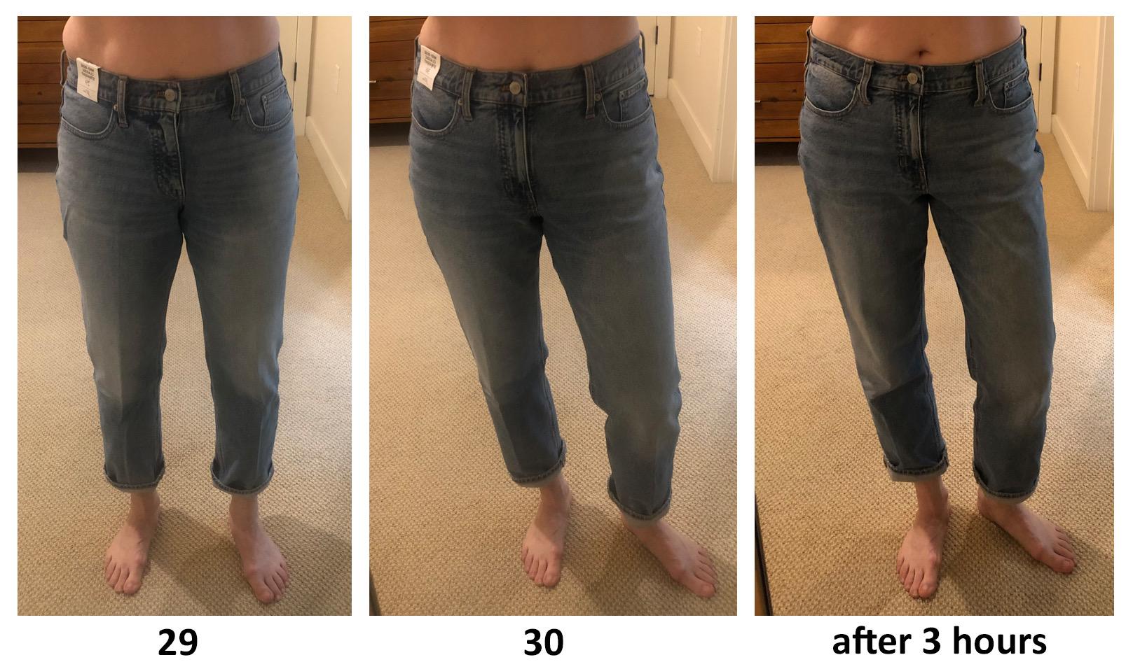 December 9, 2022I was really excited to see these available with a mid-rise... (I'm not fond of all the high-rise cuts these days). I'm normally a 29 in JCrew, and based on the "runs small" reviews, I ordered both 29 and 30. The attached photo shows how they looked; muffin-top with the 29, and seemingly a perfect fit with 30 (right at my bellybutton as I like it). HOWEVER. After a half-day's worth of wear, my chosen size 30 stretched out and were slipping down constantly. Not the end of the world, but I wish I'd have gone with the 29 as I am continually yanking these up. Otherwise, the cut is nice, the length good, the light wash is my style.