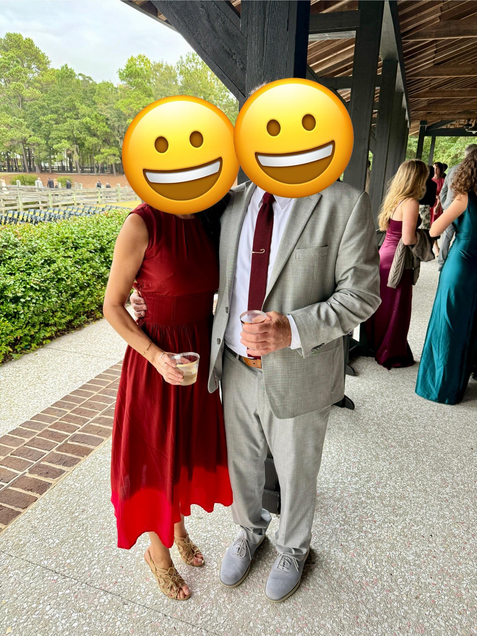 November 14, 2025I wore this to a wedding and got so many complements. It’s beautifully tailored so it really gives an hourglass shape. The material cinches at the waist but flows quickly so it doesn’t feel unflattering over the tummy where so many of us try and hide our pooch! The red on top is a a brick red shade and the bottom dip is a brighter candy apple red.