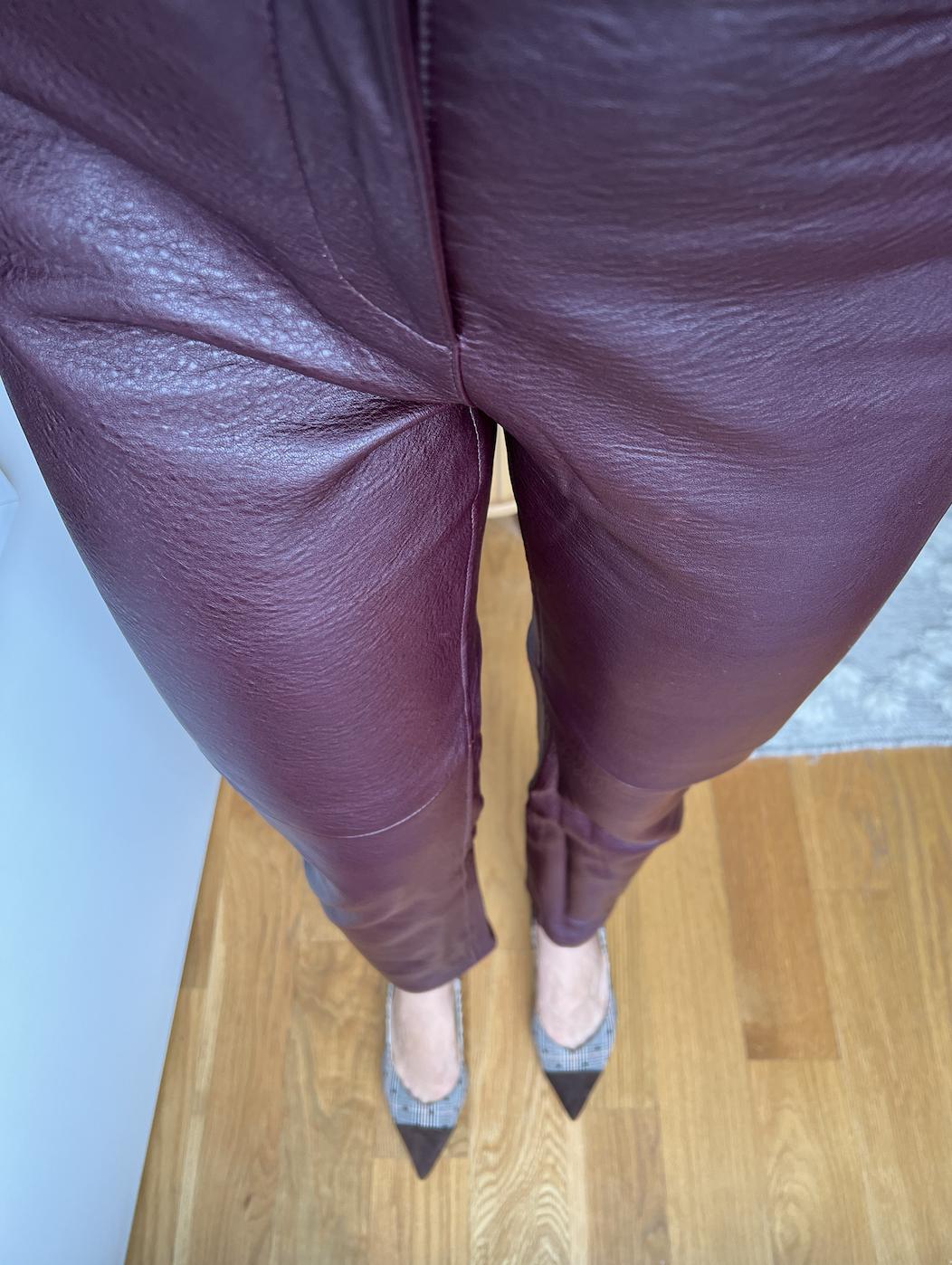 September 26, 2023These pants are truly beautiful quality. The leather is soft and buttery, and they're fully lined. I will say that the color was a surprise to me. I was expecting a dark brown, but they're burgundy, almost verging on purple. I found them true to size for JCrew, meaning they run a little large. I'm generally an 8 in pants in other brands and a 6 in JCrew, and a 6 was perfect for these (fit a little snug at first, but stretched within minutes of wearing). They are super long - I'm 5'11" and they're full length on me. They do have a slightly unpleasant smell fresh out of the box, which I'm sure will disappear soon. I'm undecided as to whether I'll keep them only because the color isn't my favorite, but I definitely recommend them if you're looking for a pair of burgundy pants.