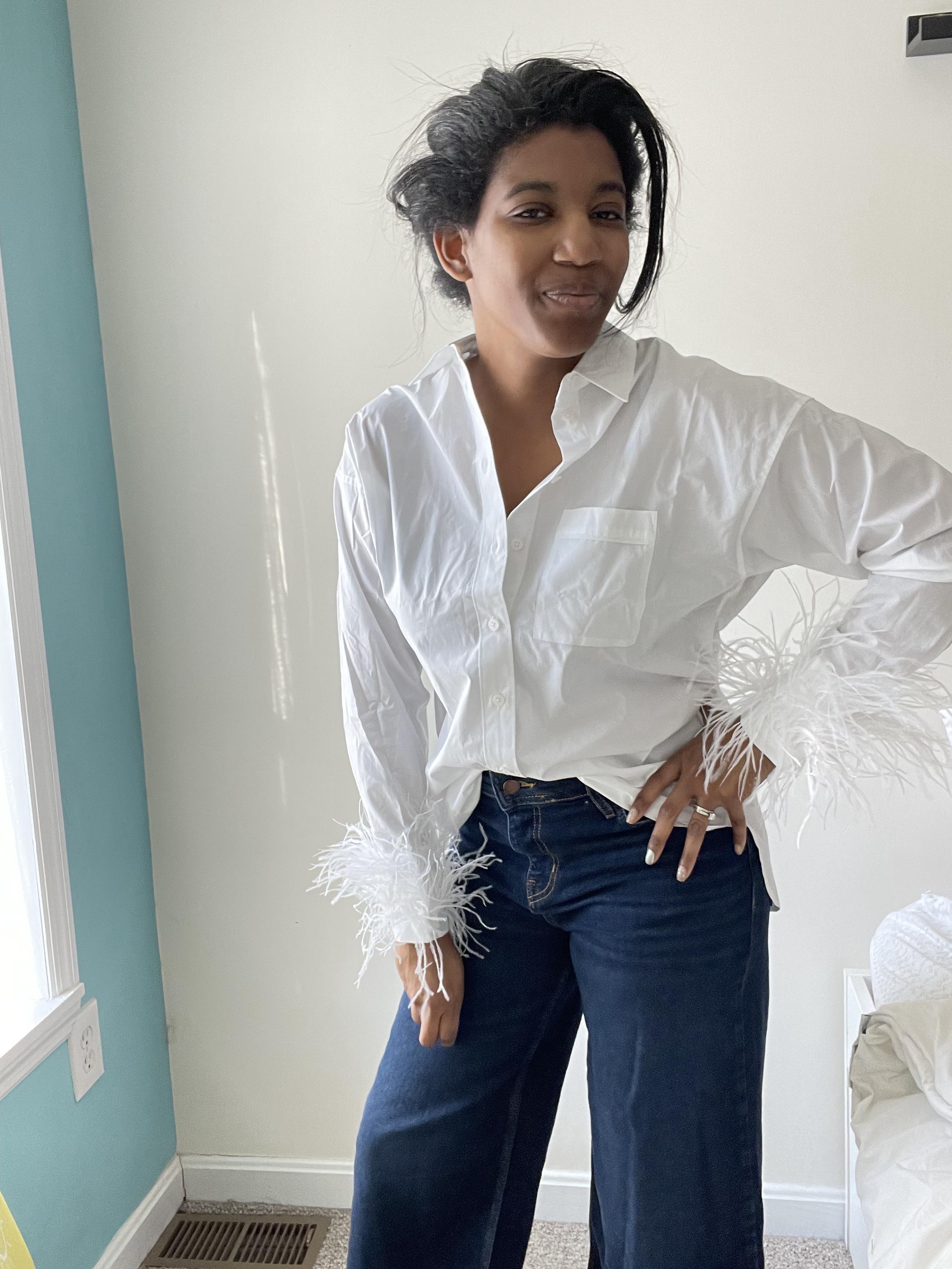 February 9, 2023This button-down shirt makes every outfit so much more fun. I bought this shirt in both the white and blue. For one of the shirts, I sized up to a 6 from my normal 4, but it wasn't necessary: the shirt runs slightly larger, which, in my opinion, makes it even more versatile. The feathers are a bit fragile. I've lost 3 since I purchased the shirt in November. (It's now February.) It's a must-have.