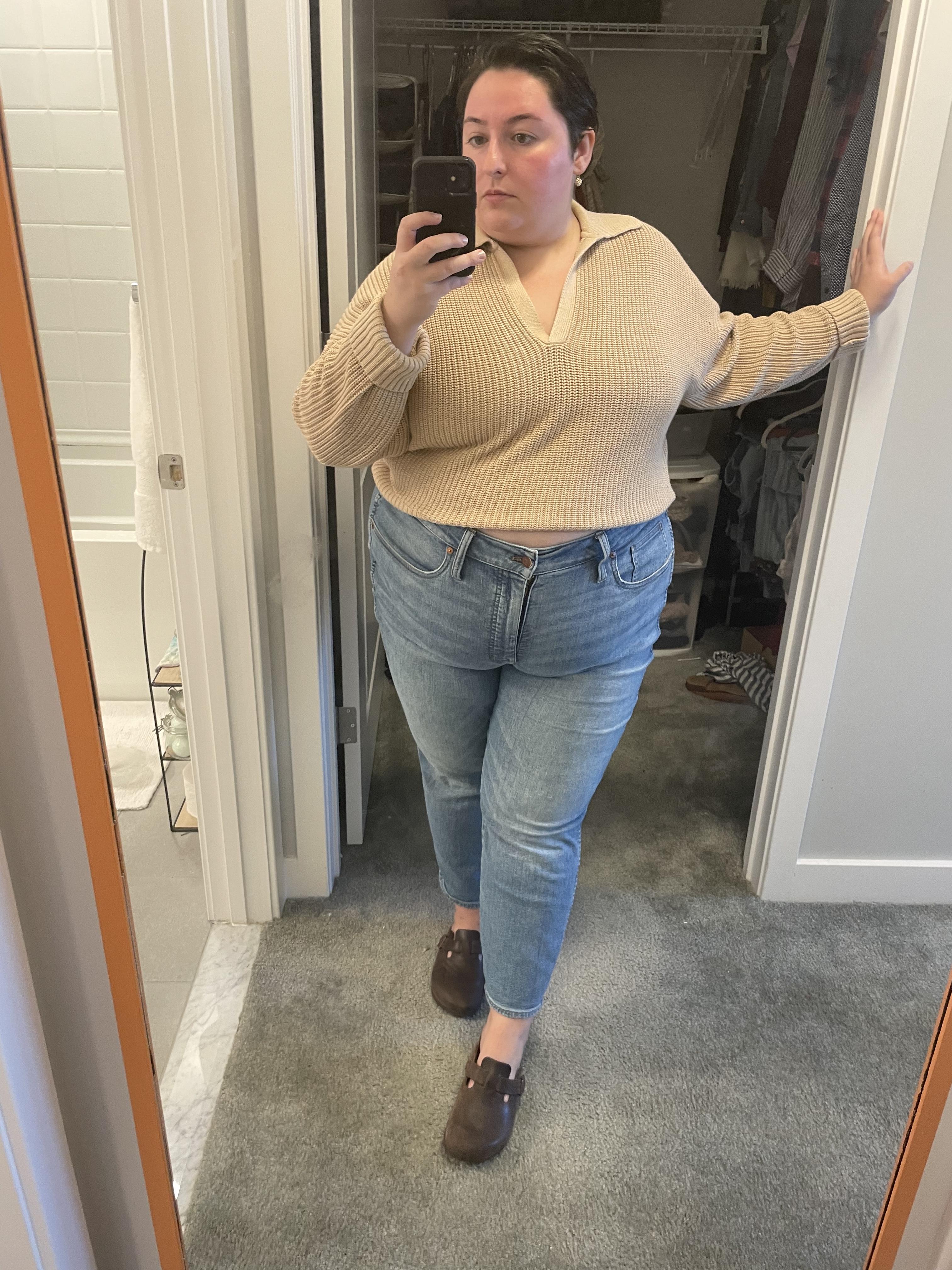 October 26, 2022I ordered a small and XS in multiple colors (5'5", 120lbs, 34b). The small has a slightly relaxed feel, while the XS is more fitted and slightly shorter, but will be great with a skirt or higher waisted jeans. The sweater is soft cotton and has a good medium weight to it, so it's perfect for at least 3 seasons. Ordered multiple colors (green, red, and cream), but the cream is the perfect neutral.