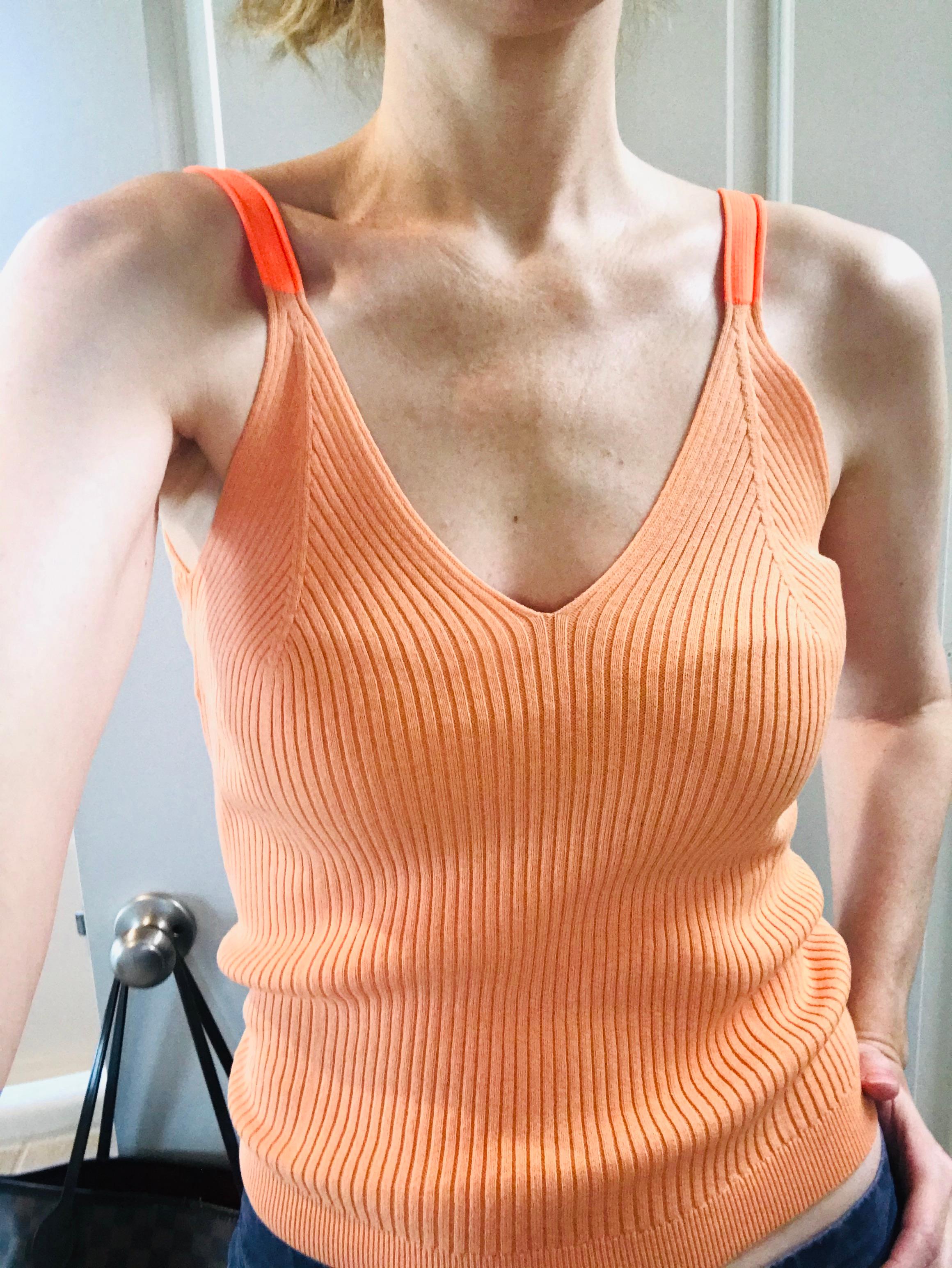 July 30, 2020Adore this top. Wish it came in more colors. The fit is perfect, I don’t even love orange but I love this peachy orange hue with the neon straps. It’s a great summer top and it makes me excited to wear it. Looks great with blue jeans or white denim and the knit is substantial without being too thick. Thank you, J.Crew!!