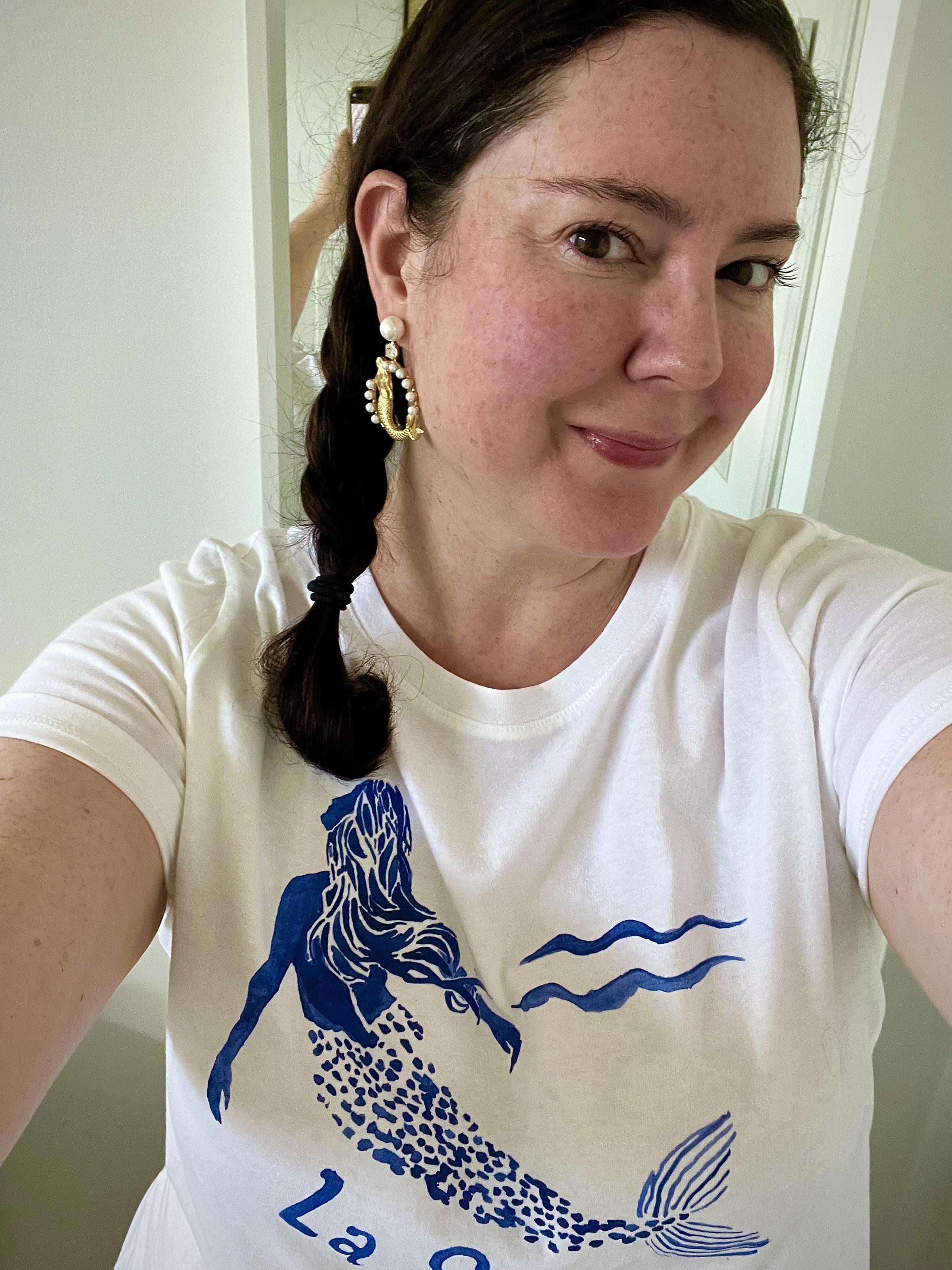 Customers really love the playful mermaid design and the unique painterly blue details that make the tee stand out. They appreciate the soft, well-made fabric that holds up well and is perfect for a relaxed, summer look. Many customers are delighted with how the graphic flatters and adds a creative edge to their outfits. Overall, the tee has become a favorite choice for those looking to add a bit of fun and style to their casual wardrobe.