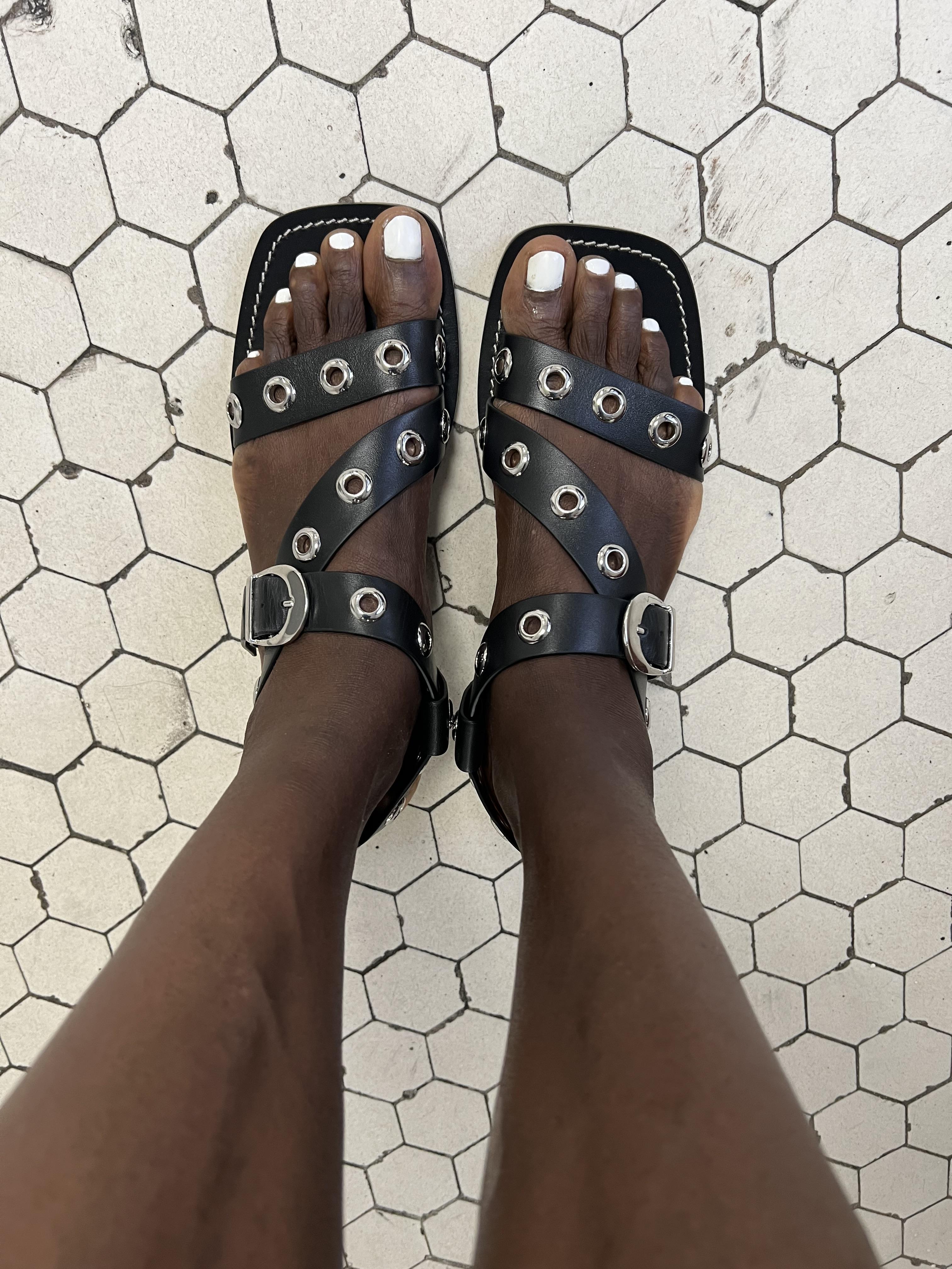 with metallic grommet embellishments. The straps and footbed are made from durable leather, designed to get better (and softer) with each wear.