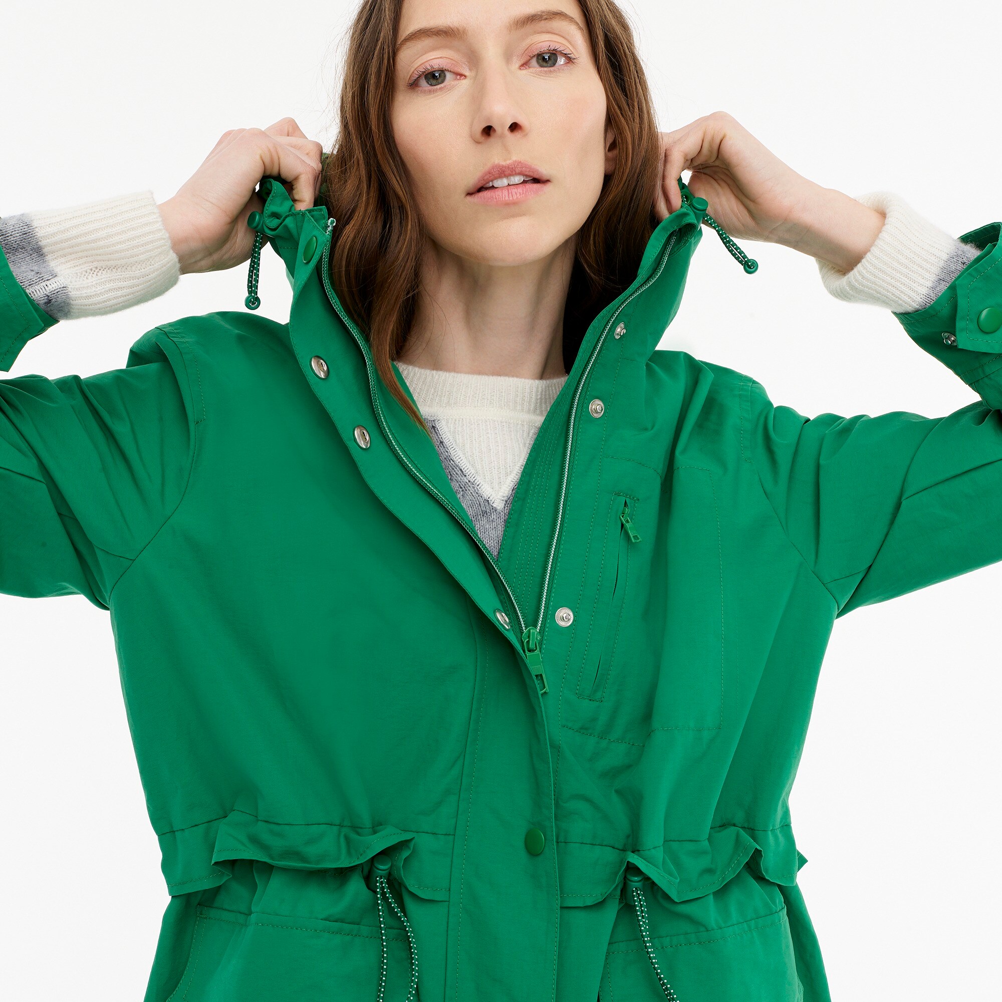 - Adjustable waist with drawcord and hood.